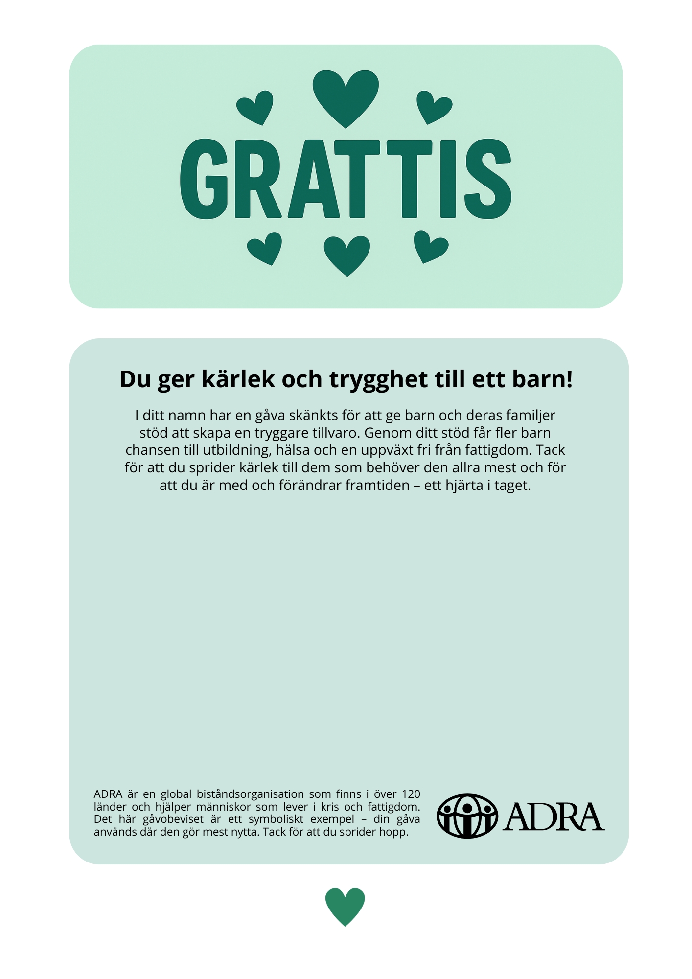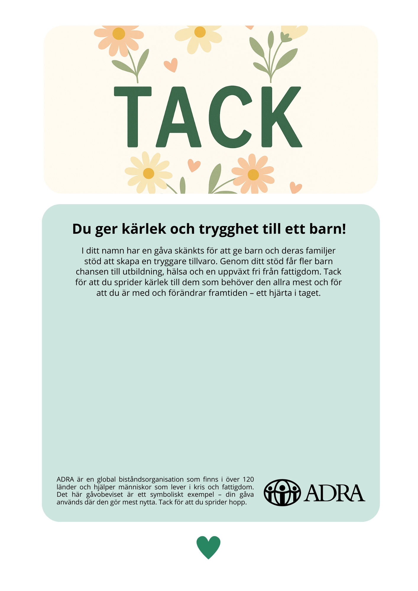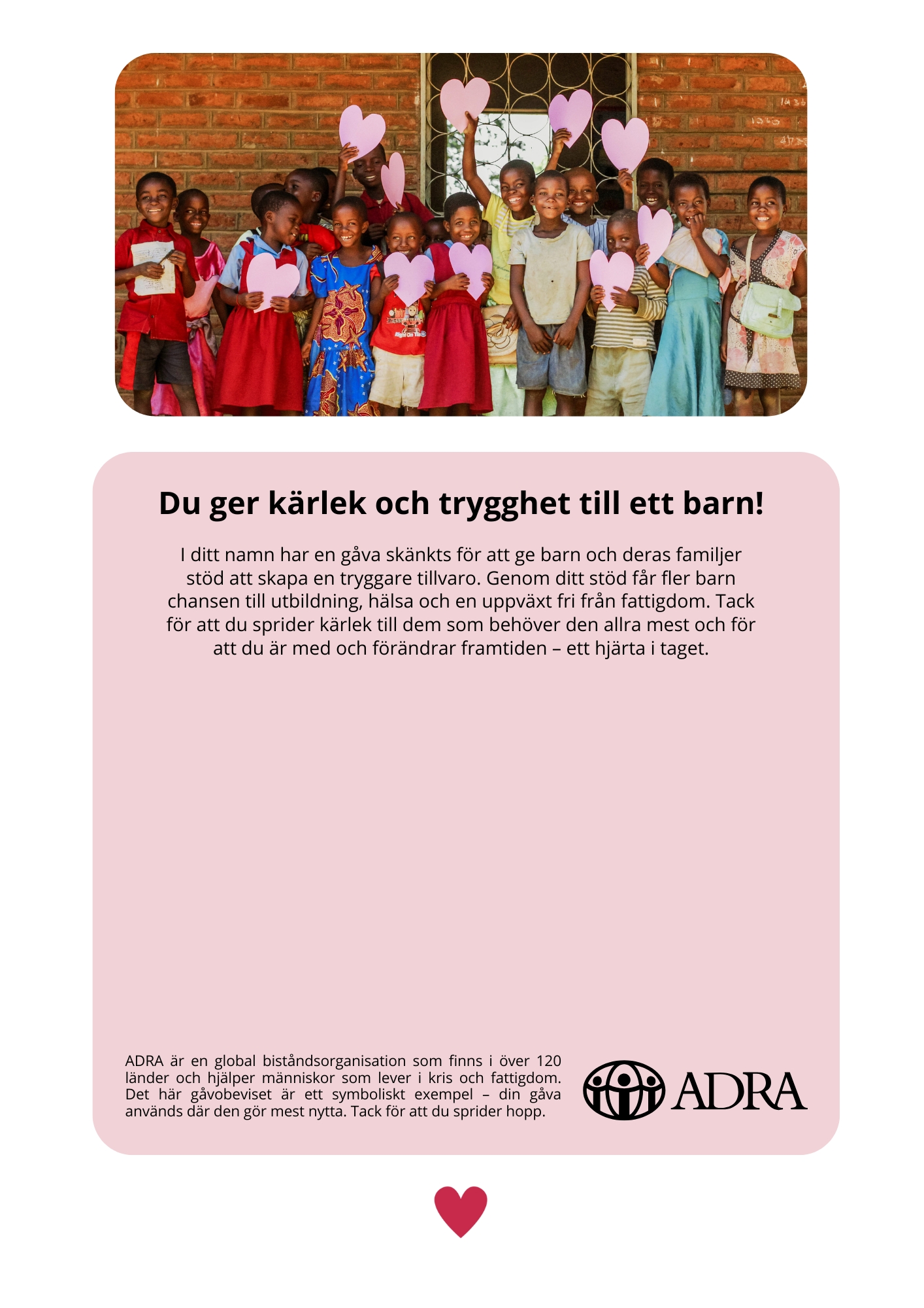 Visa din kärlek på alla hjärtans dag genom att ge ett barn möjligheten att växa upp i trygghet. Din gåva bidrar till att ge barn som lever i utsatthet tillgång till skola, mat, omsorg och en säker miljö där de får vara just barn. Ett hjärta av papper i en liten hand blir här en symbol för ett löfte om en bättre morgondag, fylld av glädje och hopp.