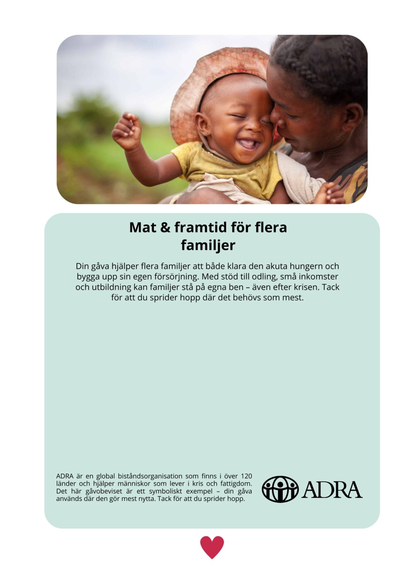 Din gåva hjälper flera familjer att både klara den akuta hungern och bygga upp sin egen försörjning. Med stöd till odling, små inkomster och utbildning kan familjer stå på egna ben – även efter krisen. Tack för att du sprider hopp där det behövs som mest.