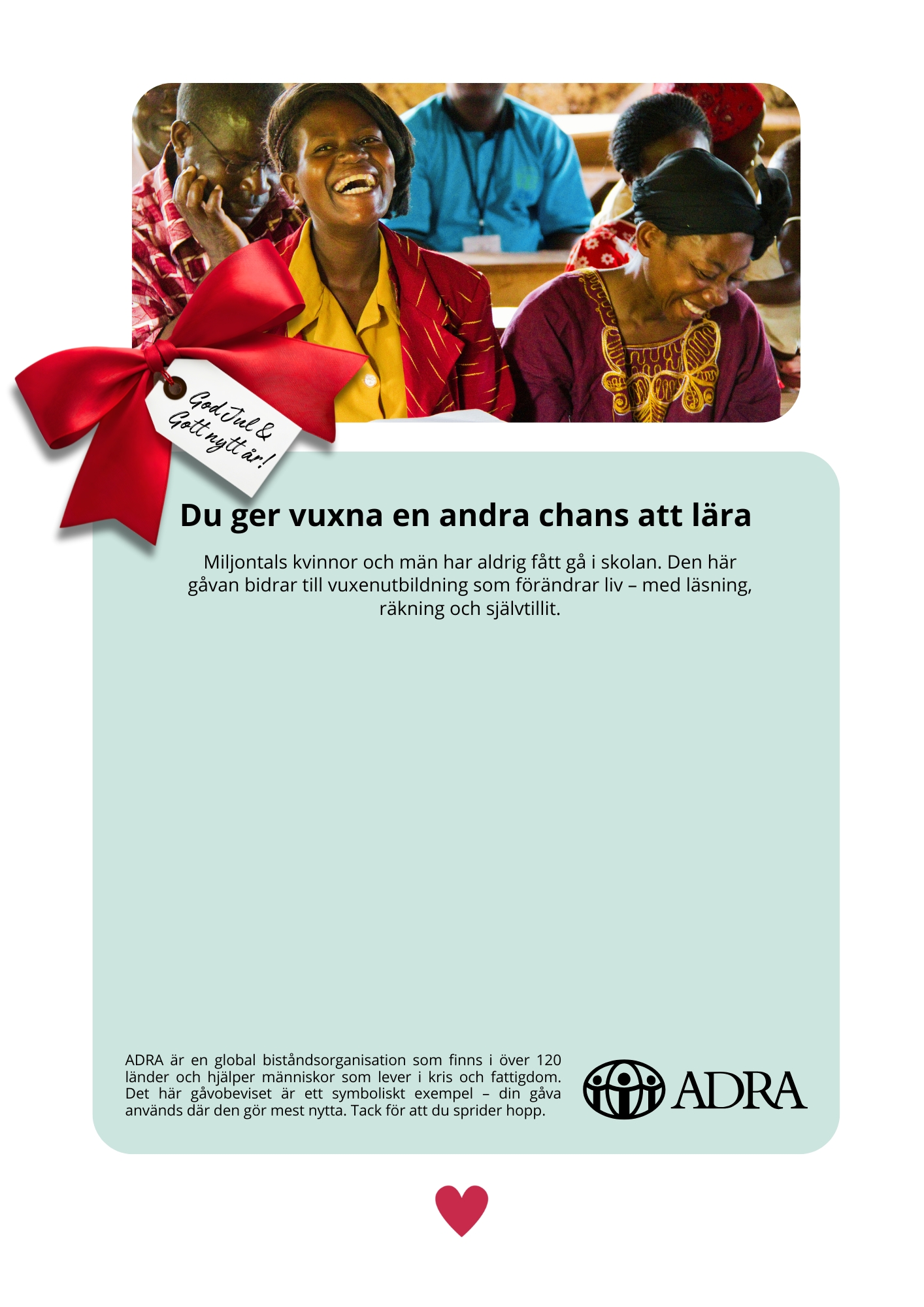 Din gåva ger kvinnor och män möjlighet att börja om. Genom ADRA:s vuxenutbildning får de grundläggande kunskaper, lär sig ta kontroll över sin ekonomi och stärker sin roll i familjen och samhället.