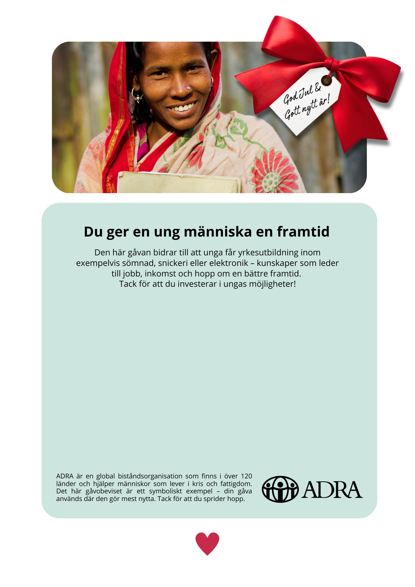 Din gåva ger en ungdom praktiska färdigheter inom t.ex. sömnad, snickeri eller elektronik och möjligheten att skapa en egen inkomst. Det ger stolthet, självständighet och nya möjligheter.